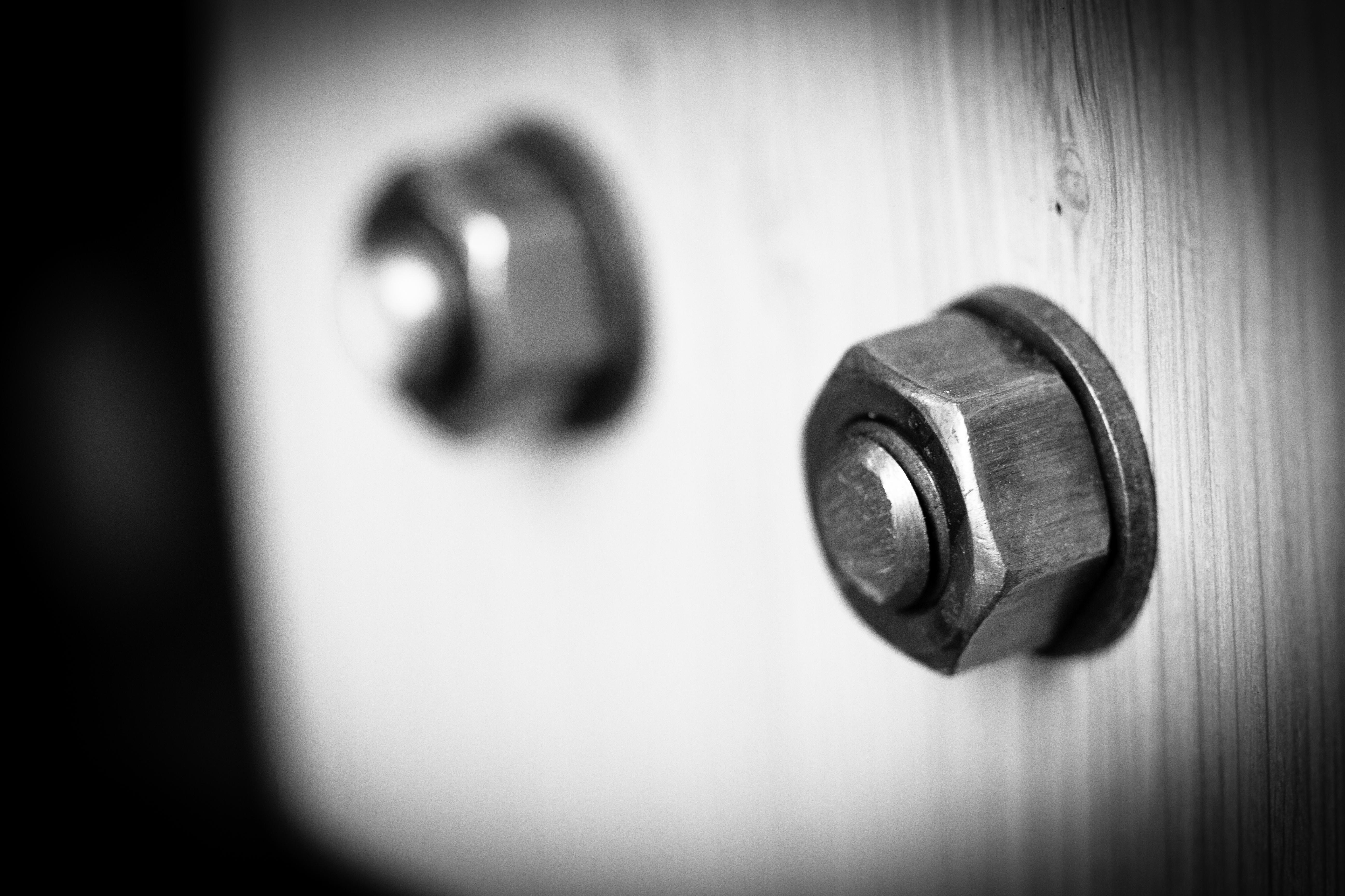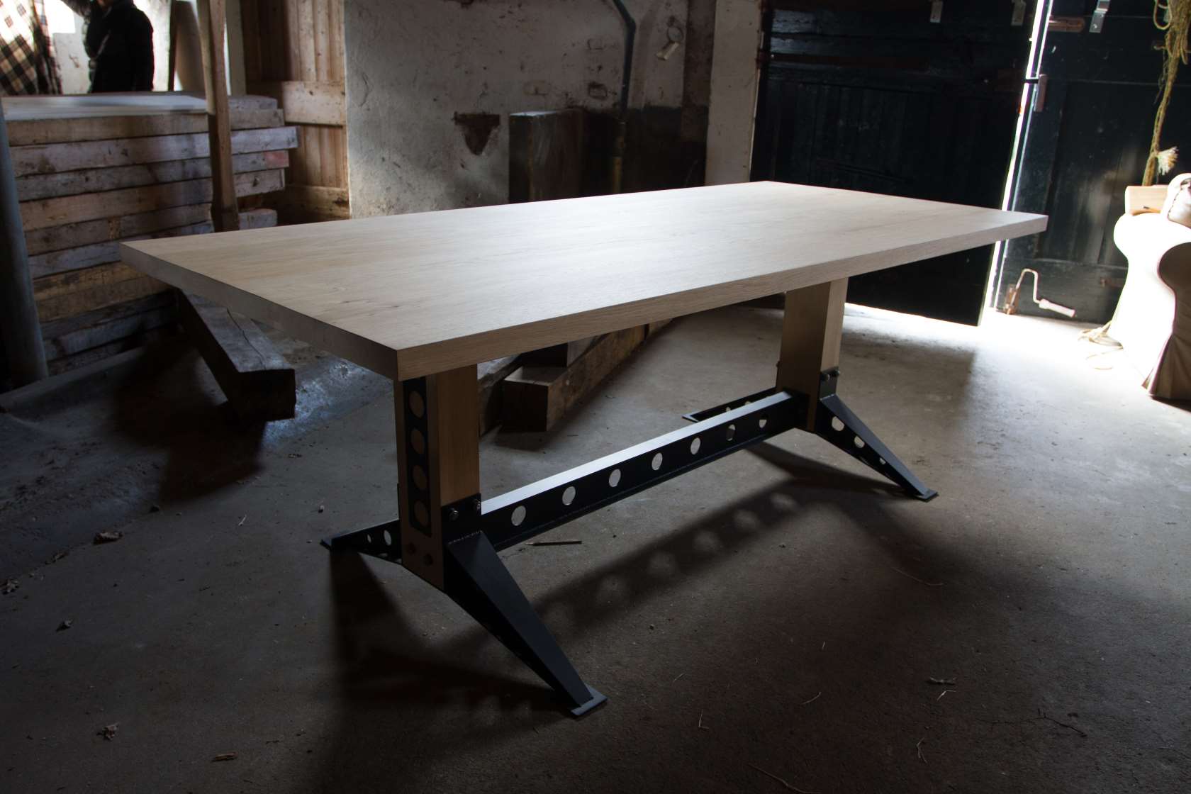 Een tafel met een eiken blad en een zwaar ijzeren onderstel.